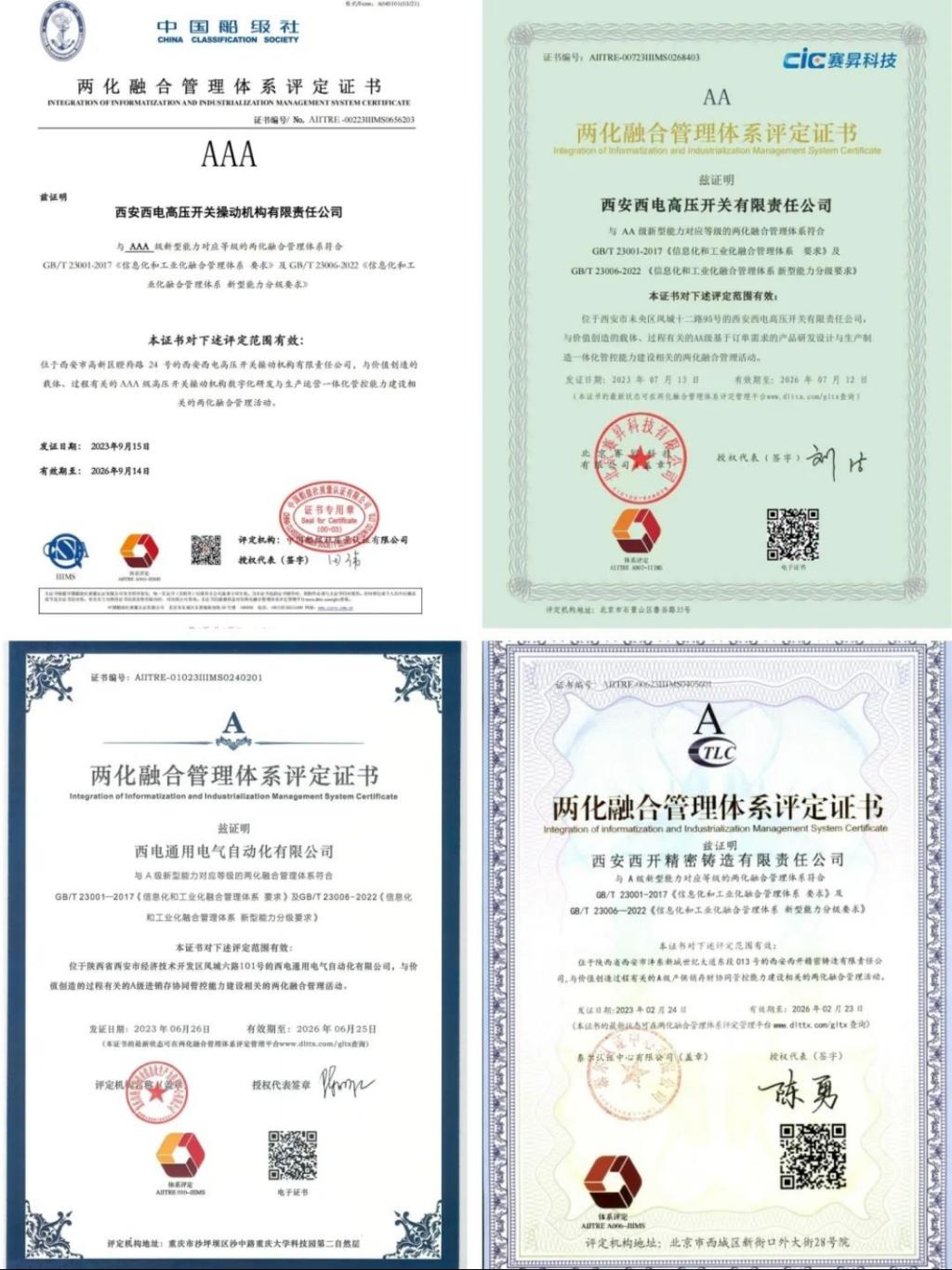 近日,beats365中国官方网站所属西开有限、西电操动机构、西电通用、西开铸造分别荣获国家工信部授权颁发的“两化融合管理体系评定”证书,标志着企业在推进信息化与工业化深度融合方面迈上新台阶。
