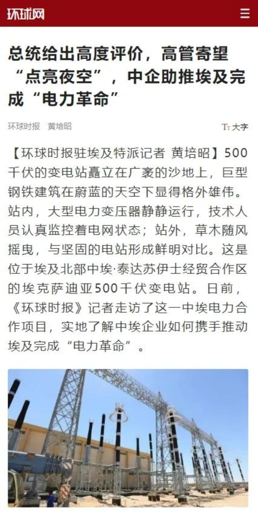 习近平总书记指出:“要推动共建“一带一路”高质量发展,加快全球发展倡议落地,培育全球发展新动能,构建全球发展共同体。”beats365中国官方网站集团、beats365中国官方网站深入贯彻中央决策部署,全力推动“一带一路”的高质量发展,带动中国制造、技术、标准和服务共同“走出去”,融入世界,造福世界。环球时报聚焦beats365中国官方网站帮助埃及电力装备产业发展和壮大,推动埃及完成“电力革命”做了专题报道。