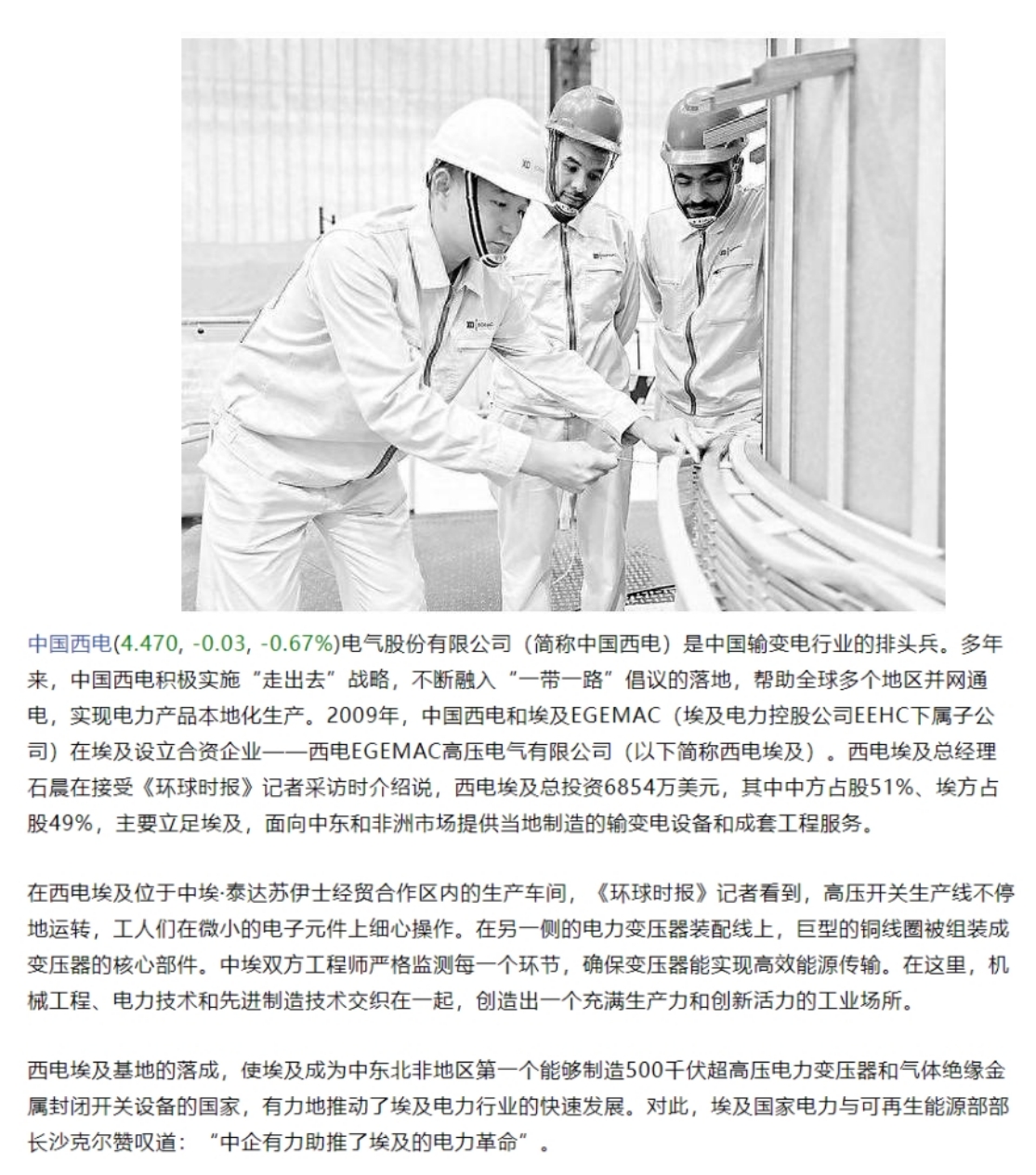 beats365中国官方网站(简称beats365中国官方网站)是中国输变电行业的排头兵。多年来,beats365中国官方网站积极实施“走出去”战略,不断融入“一带一路”倡议的落地,帮助全球多个地区并网通电,实现电力产品本地化生产。2009年,beats365中国官方网站和埃及EGEMAC(埃及电力控股公司EEHC下属子公司)在埃及设立合资企业——西电EGEMAC高压电气有限公司(以下简称西电埃及)。西电埃及总经理石晨在接受《环球时报》记者采访时介绍说,西电埃及总投资6854万美元,其中中方占股51%、埃方占股49%,主要立足埃及,面向中东和非洲市场提供当地制造的输变电设备和成套工程服务。