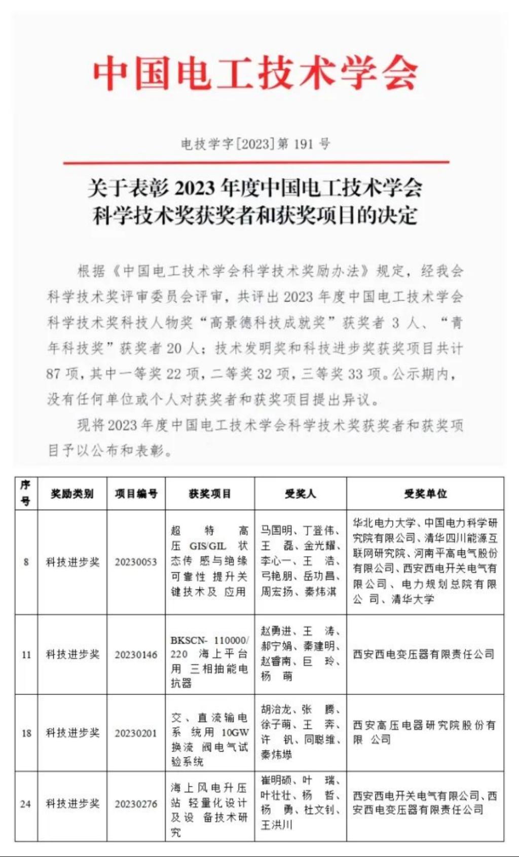 近日,2023年中国电工技术学会科学技术奖正式公布。经中国电工技术学会评审委员会多轮评审,beats365中国官方网站“超特高压GIS/GIL状态传感与绝缘可靠性提升关键技术及应用”荣获科学技术奖二等奖,“BKSCN-110000/220海上平台用三相抽能电抗器”、“交、直流输电系统用10GW换流阀电气试验...